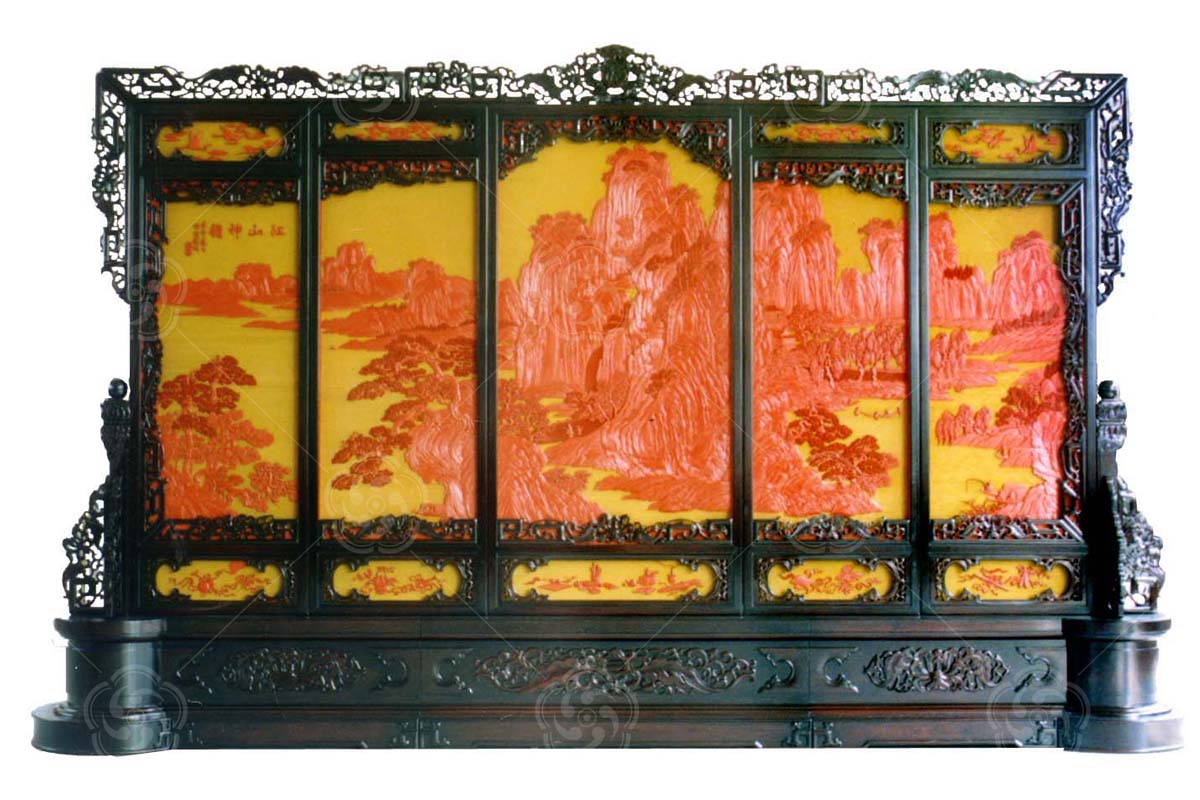 整幅作品的雕刻藝術(shù)獨具匠心,畫面中粗獷處山石塊面刀砍斧劈,精微處圖案錦紋一絲不茍,天空和溪流雕刻黃色錦紋,襯托紅色大幅浮雕圖案,數(shù)萬根細如發(fā)絲的水紋無一絲紊亂,萬組錦紋無一刀傾斜。地屏上下窗格中雕刻了云鶴、琴棋書畫、八仙法寶等裝飾紋樣,烘托了主題畫面。作品背面采用刻漆貼真金工藝,刻制了《梅蘭菊竹》、《歲寒三友》金碧輝煌的畫面,配上紅木雕花底座,使整個作品高雅精致,美不勝收,舉世無雙,確屬一座精美的珍品。