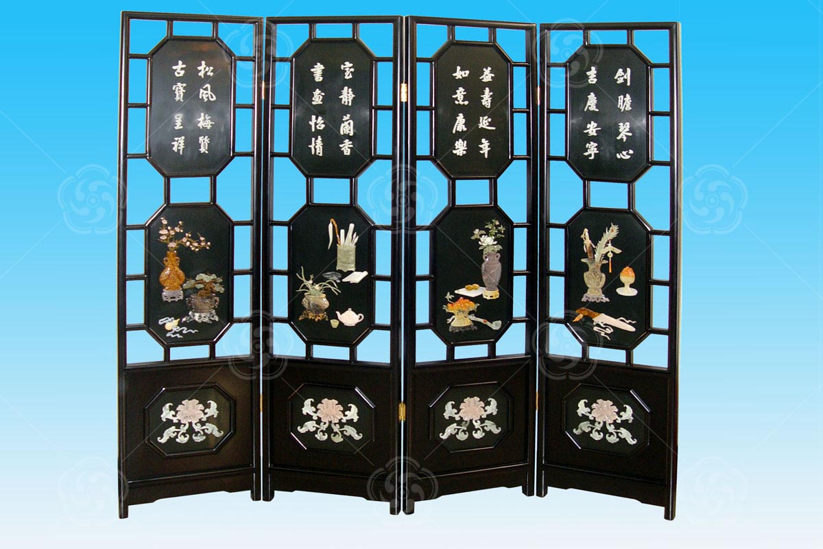 骨石鑲嵌是明代揚(yáng)州人周柱所創(chuàng)的裝飾工藝,是揚(yáng)州漆器傳統(tǒng)品種。該裝飾工藝采用象牙、牛骨、云母、珍珠貝、石決明、壽山石、青田石等各種材料,運(yùn)用浮雕、圓雕、鏤空、包鑲、鑲嵌、畫(huà)金等技法,產(chǎn)品具有色彩豐富、雕刻精致、圖案優(yōu)美、立體感強(qiáng)、自然生動(dòng)的藝術(shù)特色。多用于各類(lèi)普、中、高檔屏風(fēng)、地屏、家具和各種旅游紀(jì)念品、禮品等。